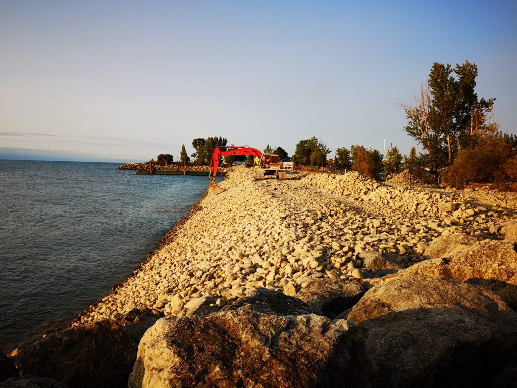 - Crews have commenced work on the slope of the structure and have formalized 20 metres of the first layer of stone. One more layer will be required to bring this structure to its final elevation following formalizing the slope for the entire structure