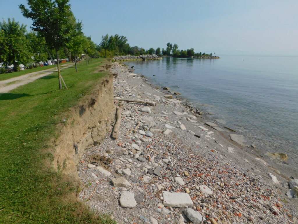 The beach was repaired by the addition of a large quantity of cobble stone, which extends into the lake. The cobbles provide dynamic protection by dissipating the wave energy and by allowing the wave action to naturally reshape the beach. The headland was repaired by adding another layer of armourstone over top of the existing structure. This strengthened the structure to better allow it to absorb the energy of wave impacts.