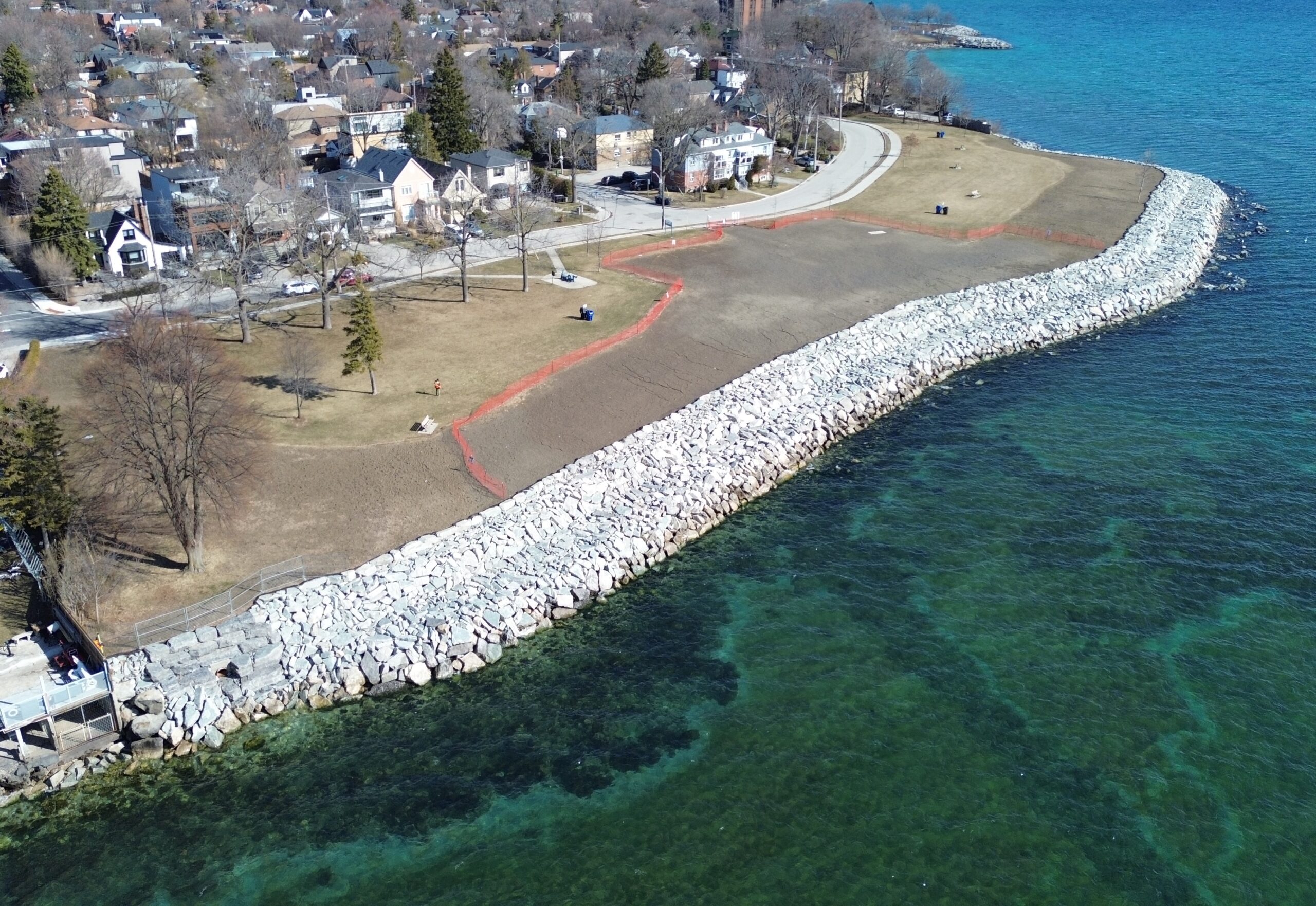 The crew has completed 25 m of construction road to access the shoreline at the east end of the park. They have been working to reconstruct the armourstone wall that protects the stormwater outfall at the park limits.