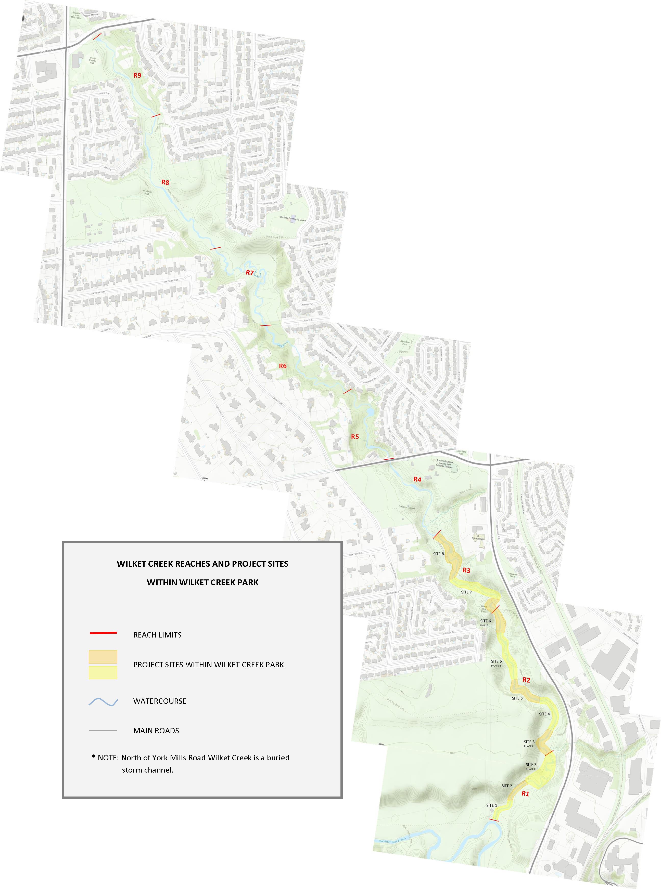 Reach 1 extends from the confluence of Wilket Creek with the West Don River upstream to the most southerly pedestrian bridge. The 480 metres (m) of watercourse that make up Reach 1 is broken up into three work sites: Site 1, Site 2 and Site 3 Phase 2.