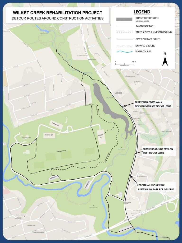 In addition to the works along the creek, construction crews anticipate some park path realignment in this area. The park path will be realigned to prevent damage to public infrastructure and increase public safety in the area, as water levels at Wilket Creek are known to quickly rise and flows quickly increase during rain events.
