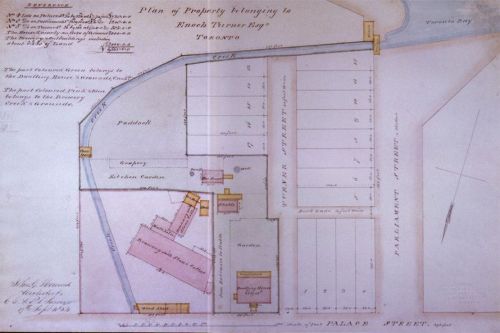 Enoch Turner’s Brewery opened in 1831 along Taddle Creek at the southeast corner of Front and Parliament near the mouth of the creek. After being in operation for one year, the brewery was devastated by fire and Turner was left without the funds to rebuild.